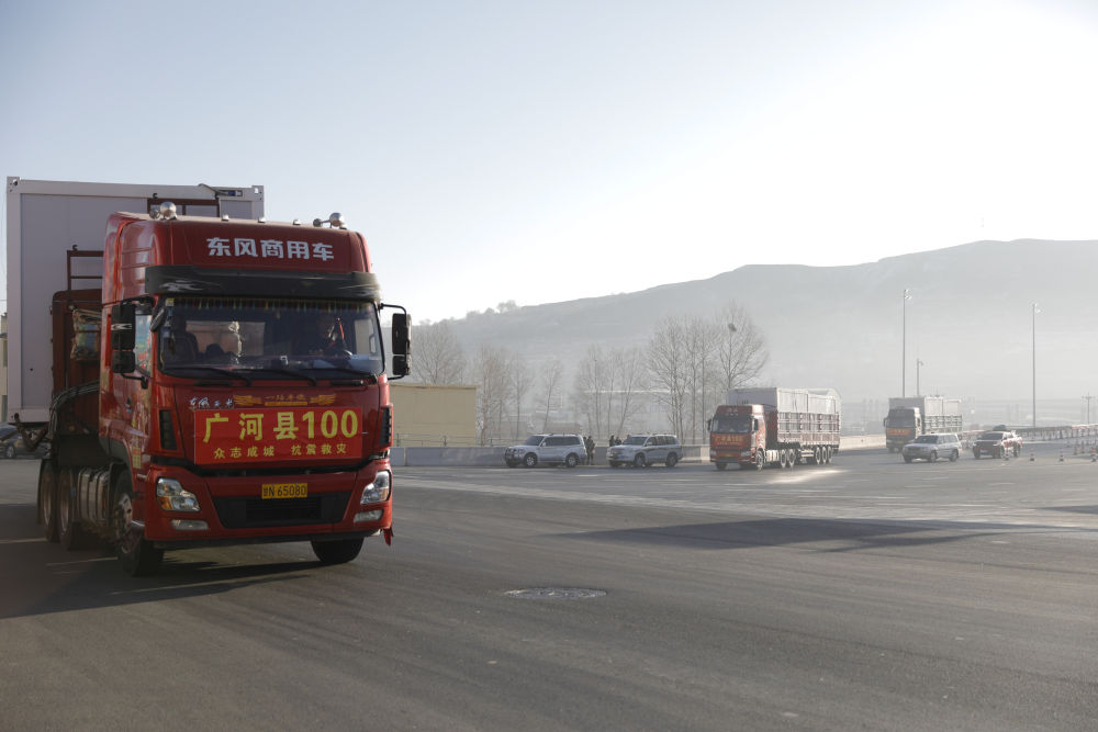 2023年12月26日,在甘肃省临夏州积石山高速出口,载着活动板房的货车驶向受灾乡镇。新华社记者方欣摄