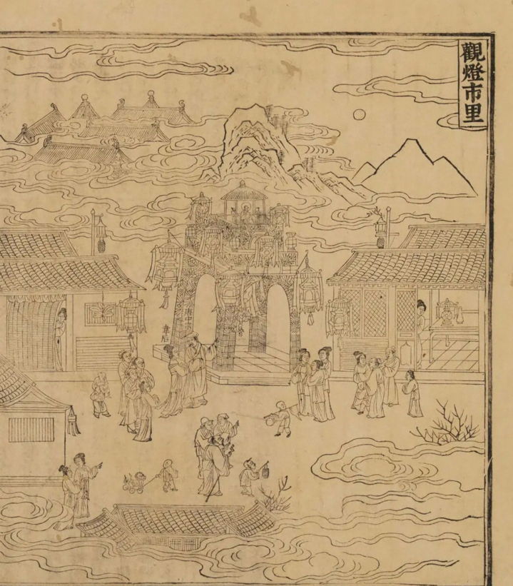 那灯火连天际的盛景,甚至引得唐中宗与韦后微服出宫,《帝鉴图说·观灯市里》载:“中宗春正月,与韦后微行观灯于市里。”所配插图亦描绘出了京城长安处处张灯结彩的热烈景象,从侧面反映出唐人对元宵灯节的喜爱,连皇帝、皇后都要违背宫闱规矩,只为一睹市井灯市的热闹,足见元宵灯景的动人。