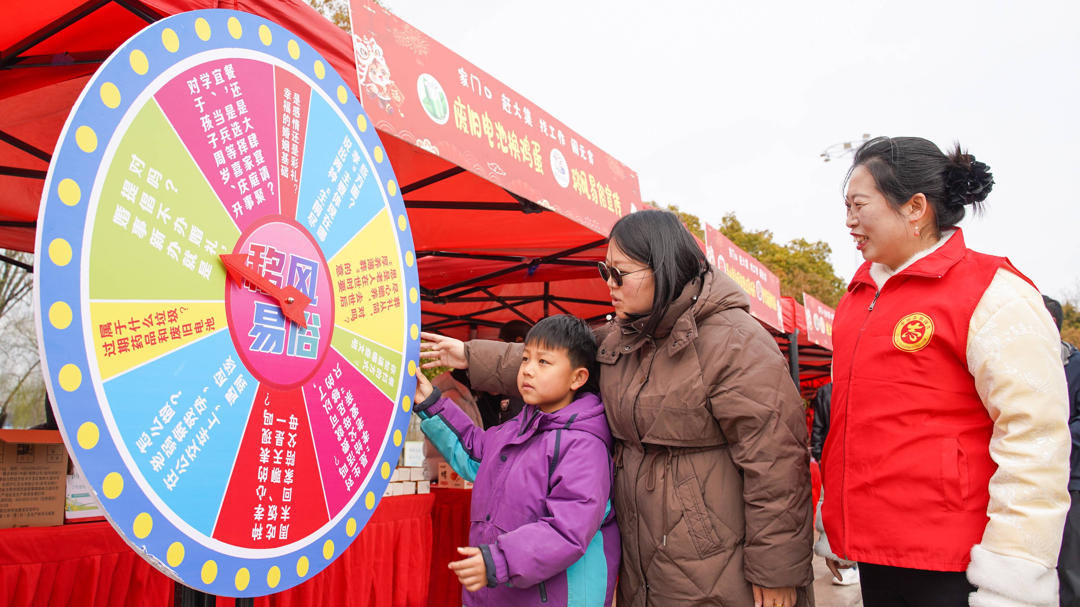 文明新风和志愿服务摊位也没闲着,移风易俗有奖问答、反诈骗知识宣传轮番开展,8岁的小朋友张舒昱转动大转盘答出“过期药品和废旧电池是有害垃圾”,领到抽纸奖品后蹦蹦跳跳地说:“太开心了,答题还能领礼物,我下次还来。”