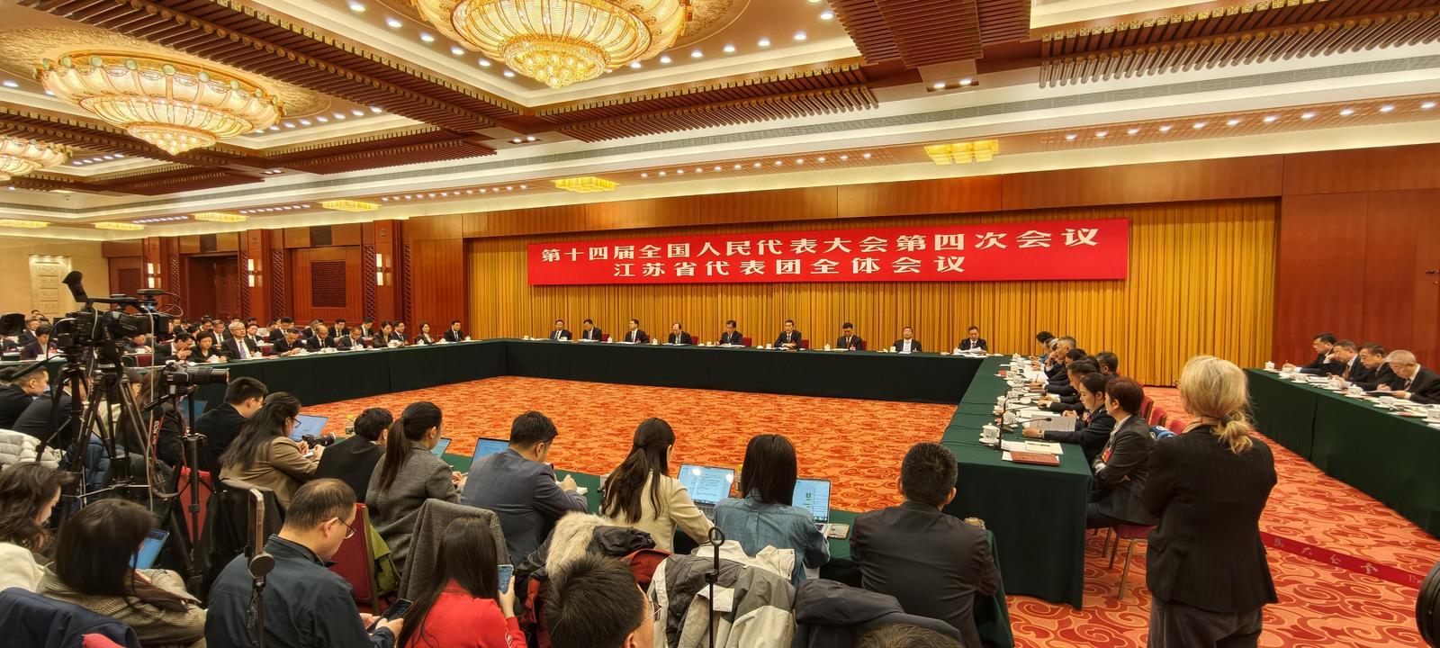 3月7日上午9点,十四届全国人大四次会议江苏代表团举行第四次全体会议,对中外媒体开放。经济大省如何挑大梁,如何答好“新”考题,为全国发展大局多作贡献……这些议题备受关注。当天,73家中外媒体、110名记者到会旁听与采访,现场人气高涨。