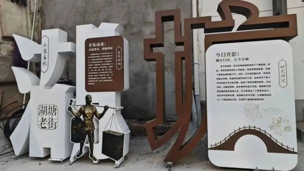 更深层的更新,是对文化记忆的擦拭。墙面嵌入“湖塘非遗”“马杭木雕”“铜雕”“留青竹刻”等字样;新增“湖塘”主题小品,镌刻老街由来与时光印记,游客可驻足端详,亦可合影留念。从民国小洋房到叮当作响的白铁铺,从中国人民银行旧址到季子书院——老街被串联成一条可走、可看、可感知的“时光长廊”。不是复刻,是唤醒。斑驳老墙与规整疏导点相安无事,历史风貌与现代功能在老街肌理中从容共生。