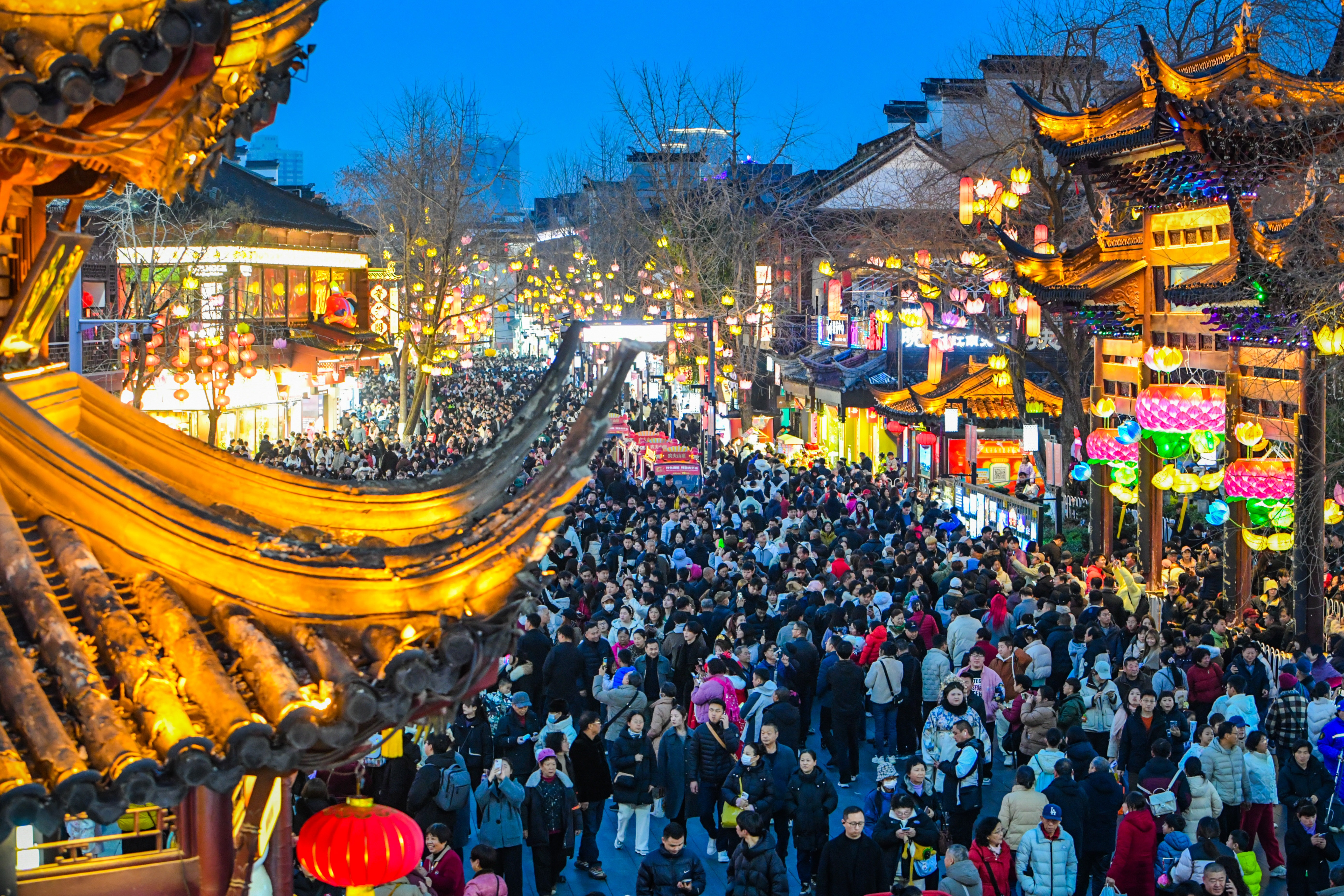 农历正月十五,南京秦淮河畔花灯璀璨,人潮如织,市民游客有序赏灯,在流光溢彩中共度元宵佳节。