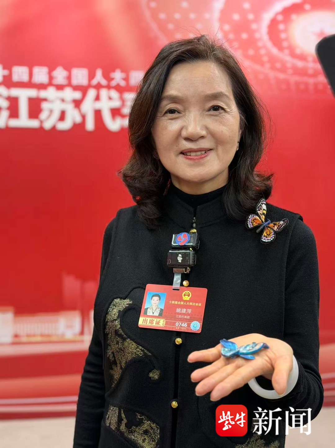 我们推动民族自主品牌出海出圈,连续多年携苏绣生活美学作品亮相法国卢浮宫、巴黎顶流家居设计展,赢得国际赞誉与合作。我胸前的苏绣胸针,正是苏绣走进生活、走向世界的缩影,让我们更加坚信:民族的就是世界的。未来,我将继续以一枚绣花针,绣美一座城、绣富一方人。