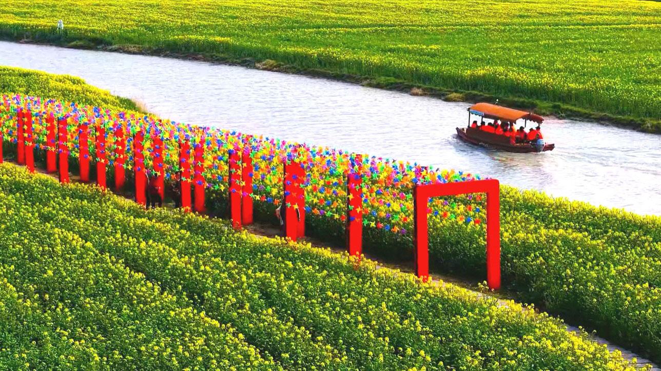 徜徉花海之中,游客可选择多种方式感受春意,或乘坐小火车穿行花田,体验被金色花浪包围的浪漫;或乘乌篷船泛舟湖上,欣赏花海与碧波相映成趣的独特景致;亦可漫步花间小径,细嗅花香,感受春日慢时光。“这里的油菜花和别处不一样,有湖水的映衬,显得更有灵气。”来自扬州市区的摄影爱好者张先生已是第三次前来,他告诉记者,每年春天都要来这里寻找创作灵感。