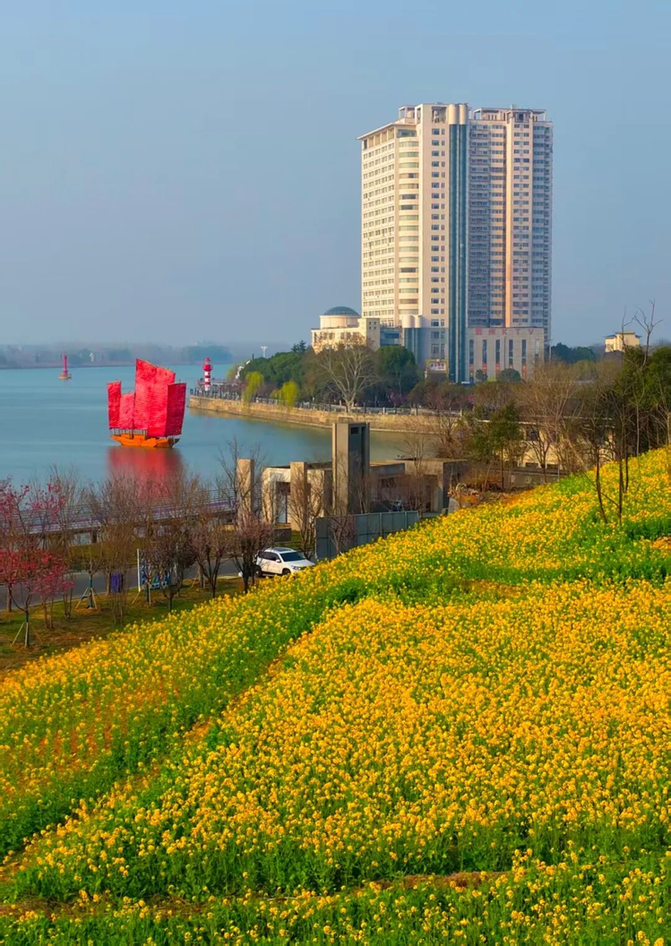 樱花枝头已挂满粉嫩的花瓣,在风中轻摇;大片的油菜花更是抢先一步,绽开点点金黄,像是给淮河岸边铺上了一层薄薄的金纱;几树红梅在粉白与金黄的簇拥中,点染出几分独特的娇艳。在澄澈的蓝天和碧水映衬下,它们把淮河畔装点得格外生动,透着一股向上的劲。