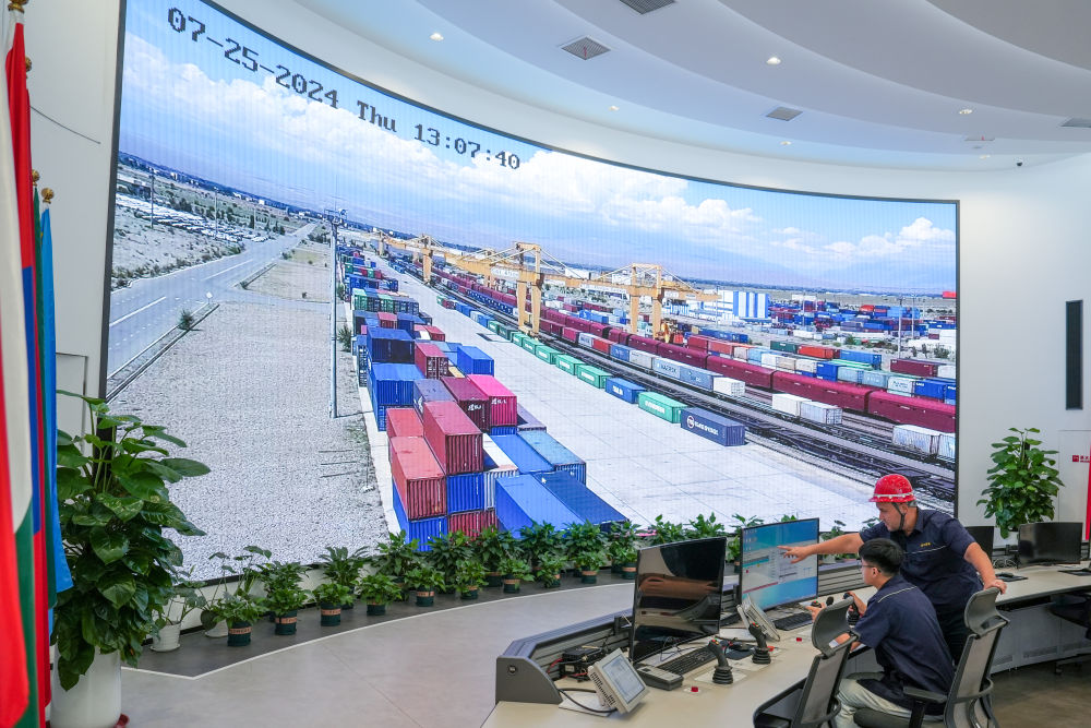 △2024年7月25日,在中哈(连云港)物流合作基地,工作人员通过“中哈物流场站”信息化跟踪系统查看集装箱运输情况。