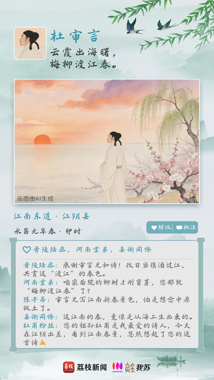 假如古人们也喜欢发朋友圈,这江南的春色定会展现出别样的诗情画意。春景无限,滋味万千。古人的春天里又藏着多少种思绪?今天,穿越古今,用AI将诗句具象化,在八位文坛大V的“朋友圈”里,感受一番他们笔下各不相同的春日心境。