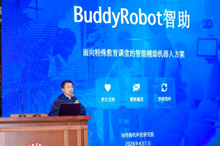 与此同时,“智助”特教情绪监测陪护机器人也在现场亮相。南京仕轩教育科技公司首席技术官常和森展示了它的核心能力:结合脑机设备,将学生情绪状态转化为“孩子现在偏紧张”“注意力下降”这类教师可直接判断的信息;根据情境生成音乐内容和引导语,帮助学生稳定情绪;课后自动生成训练报告与成长档案,整理出家校协同训练单。