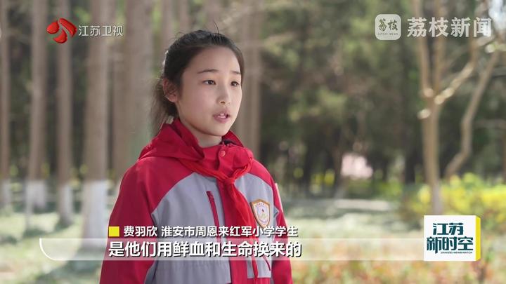 淮安市周恩来红军小学学生费羽欣说:“今天的幸福生活,是他们用鲜血和生命换来的。我要铭记历史、不怕困难、好好学习,争做新时代好少年。”