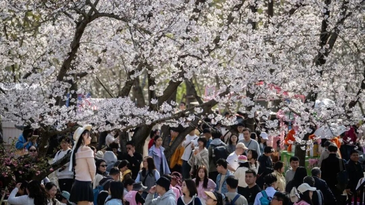 多个旅游平台数据显示,鼋头渚樱花在全国热门目的地上,人气热度位居前列。鼋头渚打破传统赏樱模式,将樱海景致与吴地文化融合,搭配古风演艺、樱花市集、露营打卡,日均接待游客超7万人次,清晨6点便迎来赏樱大军。