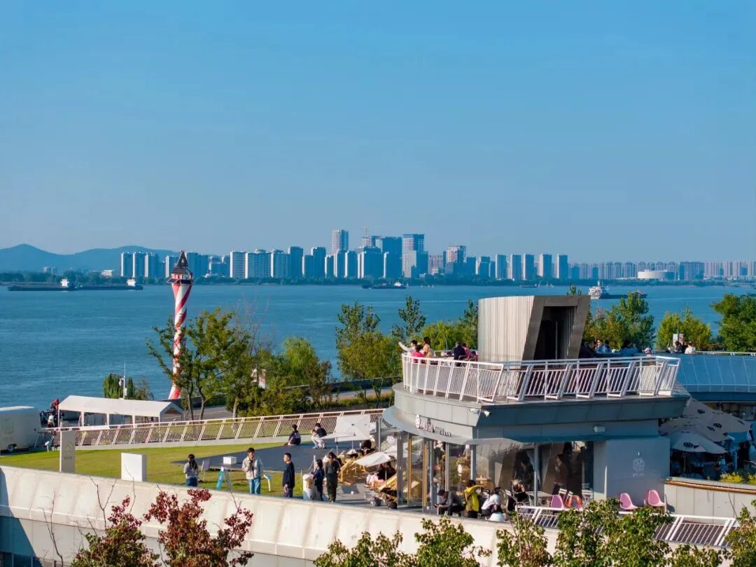 上周末午后,江心洲环岛西路人来人往。ROCHO灯塔咖啡馆内座无虚席,户外的草坪上,前来打卡拍照的市民游客络绎不绝。在这座由泵站改造而来的环形建筑内,一楼的全景落地窗将长江景致尽收眼底,二楼的开阔露台与门前的大片草坪,成了网友戏称“削尖了脑袋都要去抢占”的长江落日观赏黄金点位。