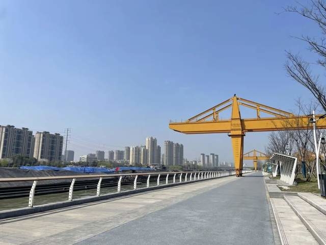 生态修复是基底,水利安全是底线。清退污染码头、拆除违建、大面积复绿,封闭的生产岸线变成了开放的滨水公共空间。堤顶道路与滨水步道巧妙设计,既保障行洪安全,又满足市民健身需求。最引人注目的,是那两座保留的龙门吊——它们不再是工业时代的“沉默者”,而是与绿茵场、滨水步道、桥梁相映成趣,成为运河百里画廊上辨识度极高的景观符号。清江浦城投集团副总经理宋丽丹说:“龙门吊代表了淮安历史上运河文化的繁盛,我们把它保留下来,形成完整的工业记忆,对老百姓而言更加可亲可感。”
