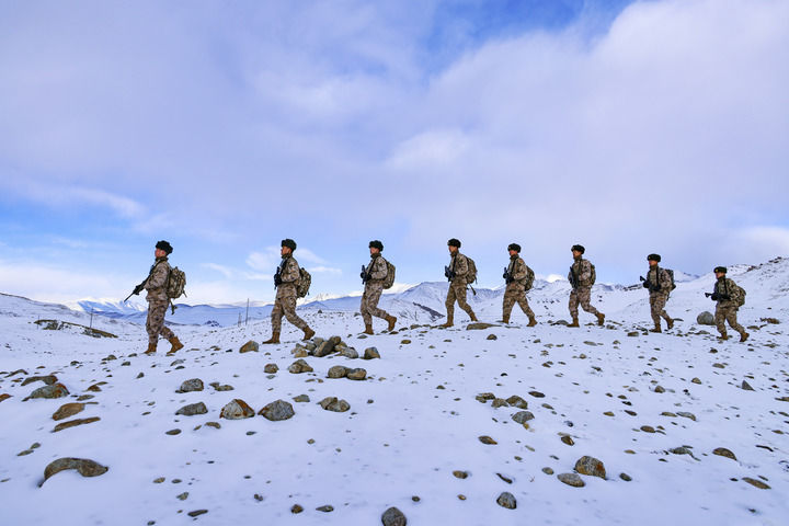 2024年2月9日,驻守帕米尔高原的新疆军区某边防团红其拉甫边防连官兵踏雪巡逻。新华社发(姬文志摄)