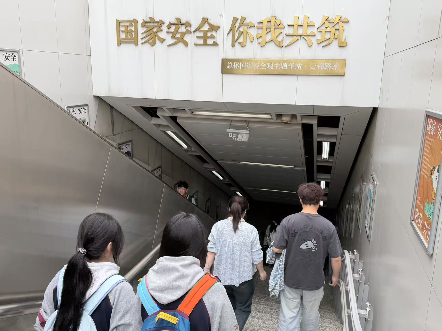 当日下午,记者从地铁4号线云锦路站1号口沿台阶下行,抬眼便可见“国家安全你我共筑”醒目牌,这便是南京依托该站打造的总体国家安全观主题站。台阶、电扶梯两侧,张挂着各类国家安全内容的小海报,涉及核安全、太空安全、深海安全等多元内容。进入通道,大型主题展板形成了一条国家安全教育风景线。