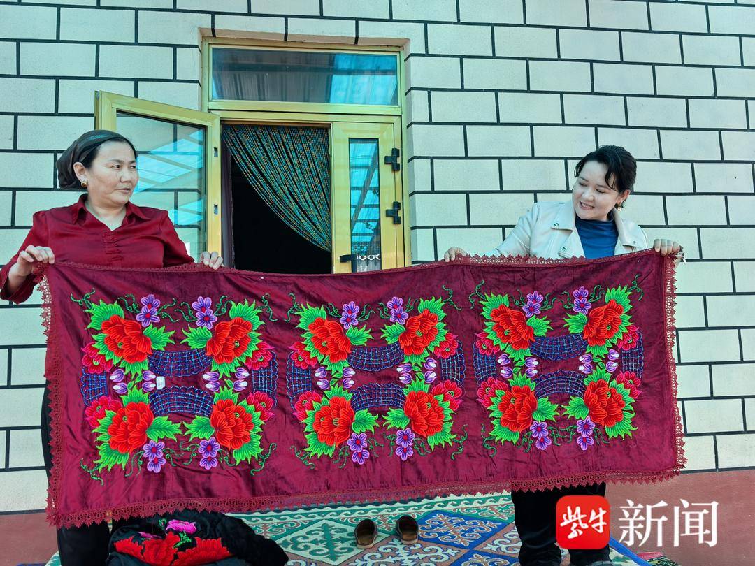 哈萨克族妇女阿娜尔汗(左)展示自己的手工绣品