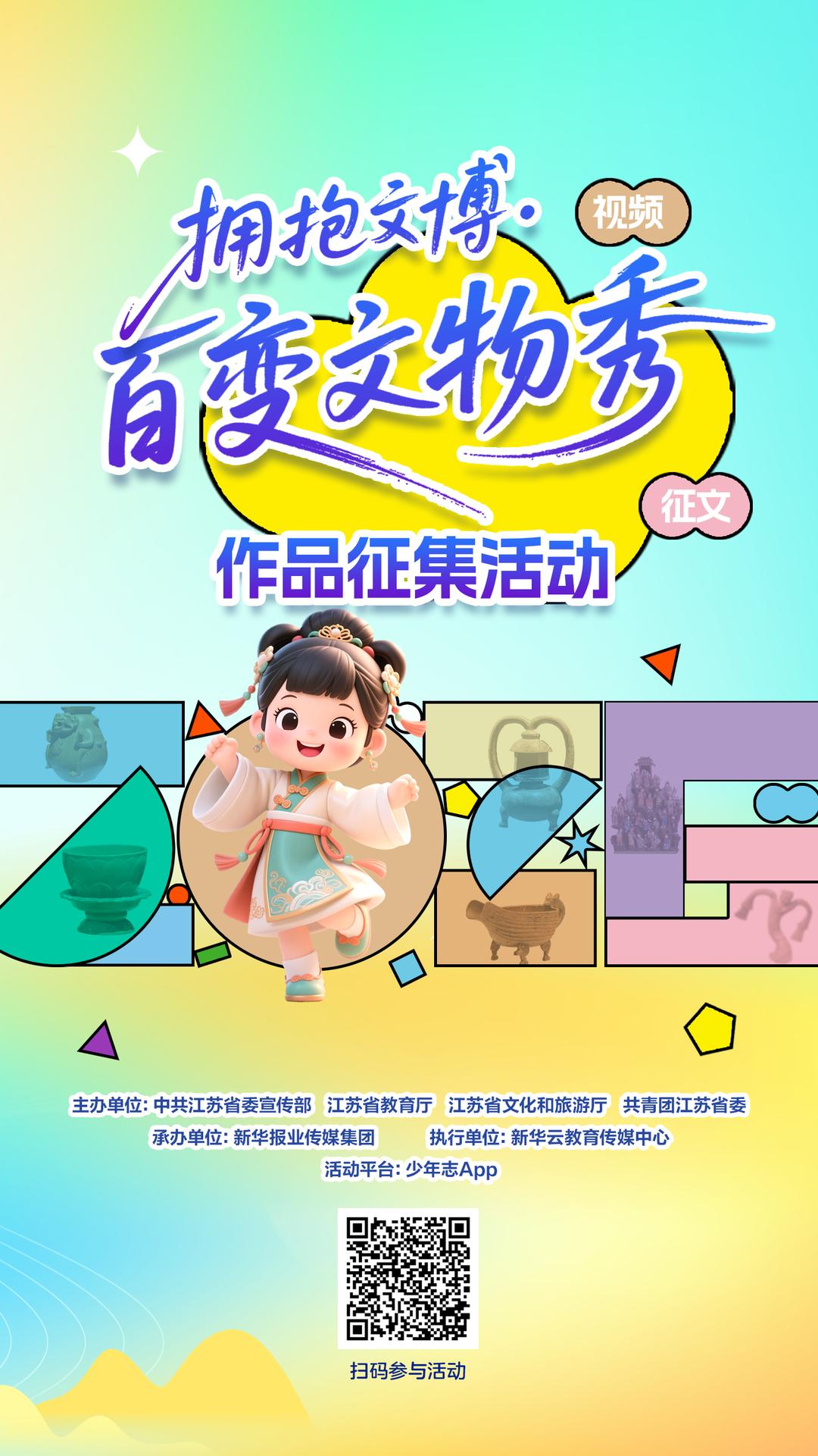 投稿可登录“少年志”App,点击首页下方“赛事”栏目,进入活动专区即可报名上传作品。集体投稿可发送至邮箱snchengzhangba@163.com。所有通过审核的选手都将获得电子参与证书,优秀作品还有机会在专题专栏中展示,被制作成“文物AI说话”等创意视频,在抖音、微博、视频号等平台推广传播,让你的创意成为独具特色的文博IP!快来加入“拥抱文博·百变文物秀”,让我们一起做文物的“小小代言人”,把江苏的文脉故事讲给更多人听!