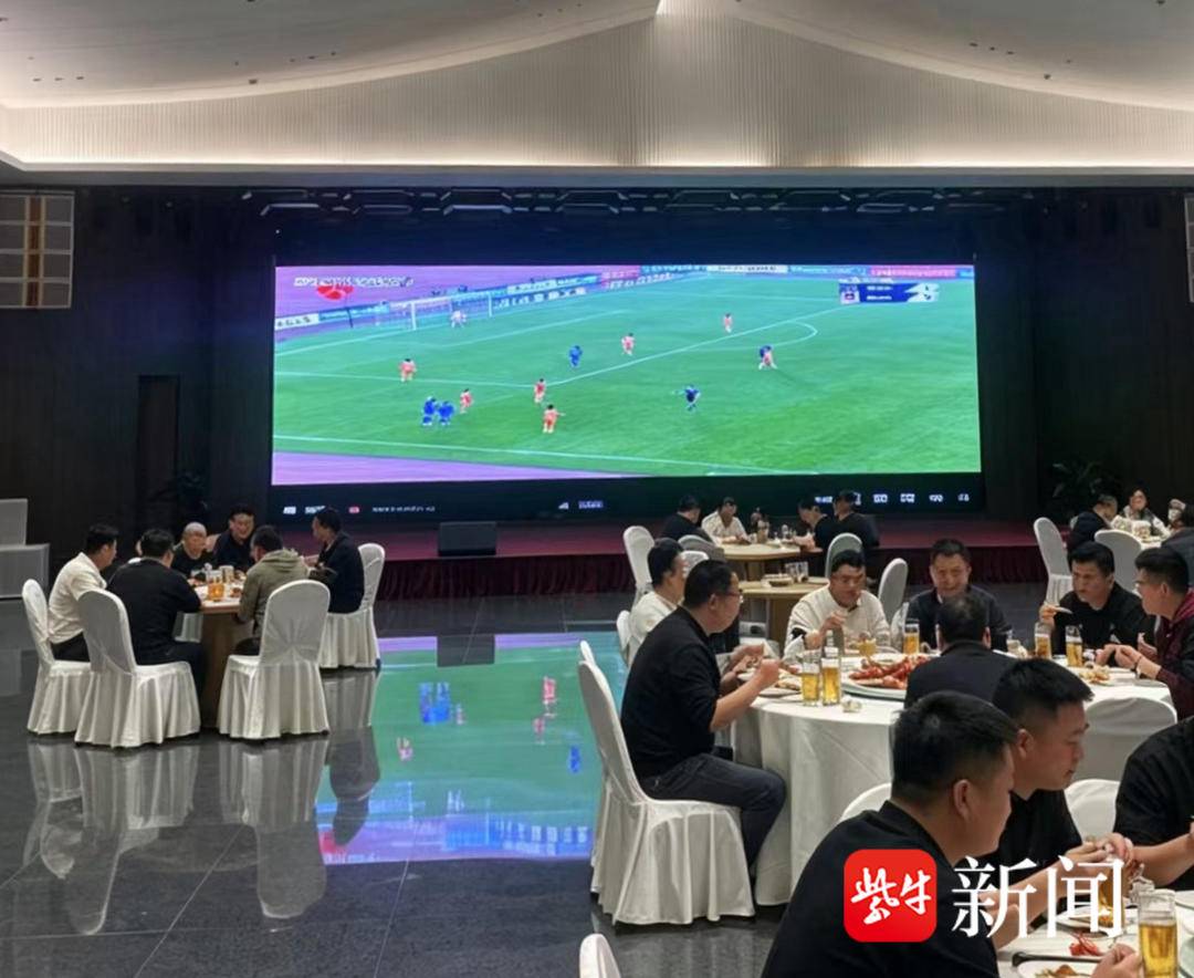 绿茵激战正酣,乡村烟火正浓!4月18日晚,宿迁牛角村度假区格外热闹。这一天是宿迁队本赛季主场对阵南京队,景区特意在牛角餐厅宴会厅设置了LED大屏直播赛事,并推出“球迷专属99元龙虾套餐”。记者看到,每张圆桌上都摆着红彤彤的小龙虾、冰镇的啤酒,球迷们边剥虾边看球,好不惬意。