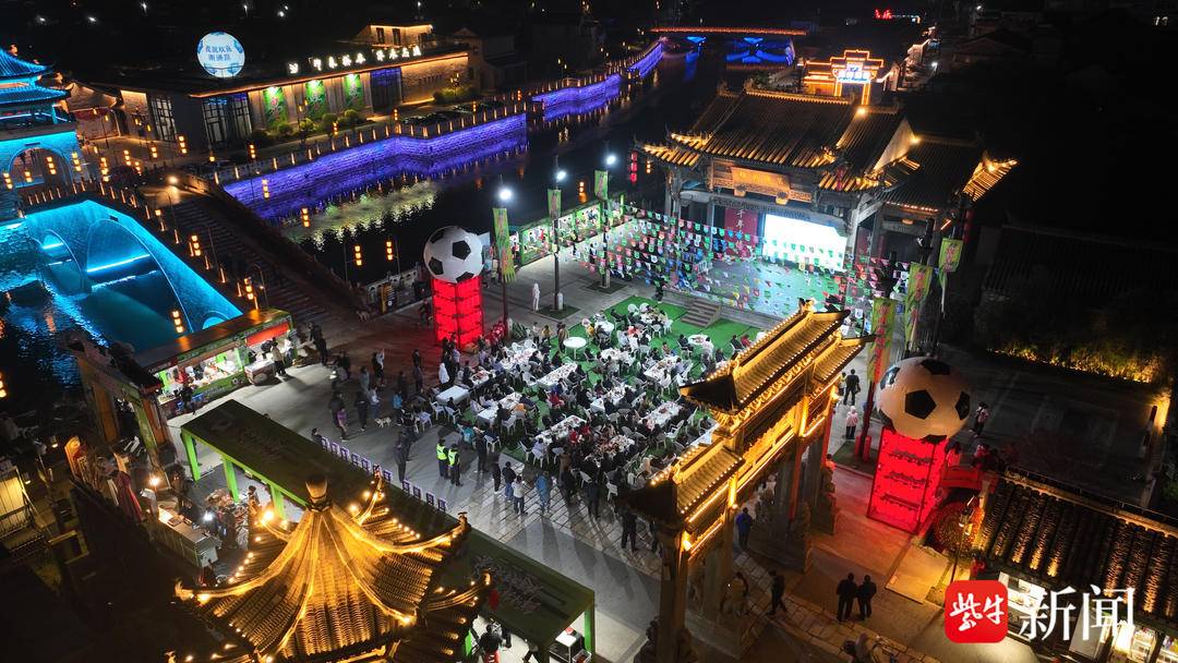 另一边,南通如东栟茶古镇把第二现场搬进古韵十足的明清戏楼,13支球队队旗迎风招展,巨型足球主题装置氛围感拉满。乐队暖场、14个海鲜美食档口、燕京啤酒畅饮……古镇将江海特色风味与足球激情完美融合。