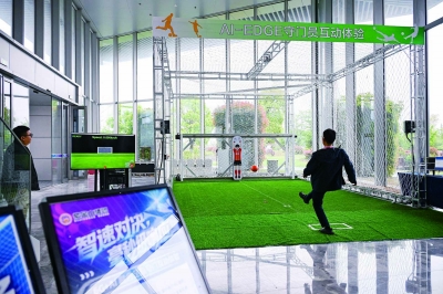 图为AI-EDGE守门员互动体验区,市民与反应速度飞快的机器人“守门员”一起踢足球。 南京日报/紫金山新闻记者 孙中元 摄