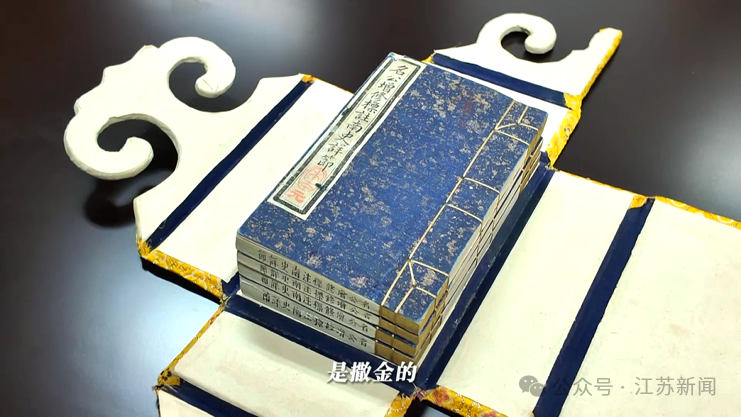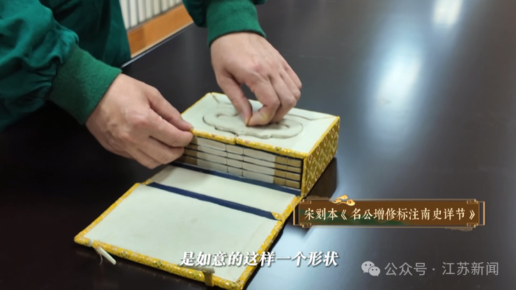 南京大学图书馆副研究馆员李轶伦缓缓拿出宋刻本《名公增修标注南史详节》。如意形的函套,封面撒金。这本书是南宋的“口袋书”,小尺寸方便读书人随身携带。装帧的时候,古人用花椒汁浸泡,所以800多年来,它从未被虫蛀。