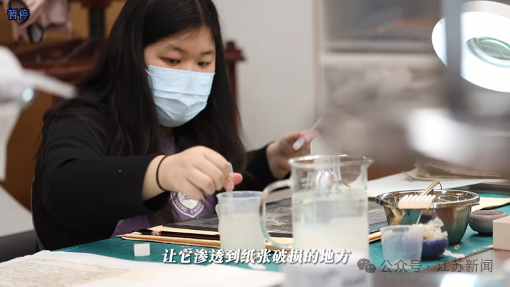 纸浆修复法是南大发明的一项专利修复技术,修复师们用传统的手工补纸,把它打成纸浆,渗透到纸张破损的地方,比传统修复的效率更高。南京大学图书馆古籍修复师陈婧认为,修复古籍有点像照顾一个病人,补的时候还能看到千百年前印刷工人留下的指纹、细细的毛发,有一种穿越时空对话的感觉。“之前的人已经用自己很大的力量去保护古籍,作为古籍修复师,就应该把它们更好地维护,传递给后人。”