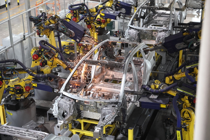 如果说镁伽科技的机器人是永不疲惫的“科学助手”,那么理想汽车常州智能制造基地的机器人就是“生产猛将”。在这里,无数机器人同时作业,协同“造车”的场景随处可见,十分震撼,可实现一分钟下线一台车,彰显了机器人“工友”加持下的高效实力。