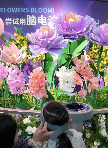 这是脑机接口技术首次从实验室走进国内科技馆。参观者只需佩戴专用设备,通过专注力控制眼前花苞的绽放。用意念开花,听起来像魔法,但在这里,它是真真切切的科学。
