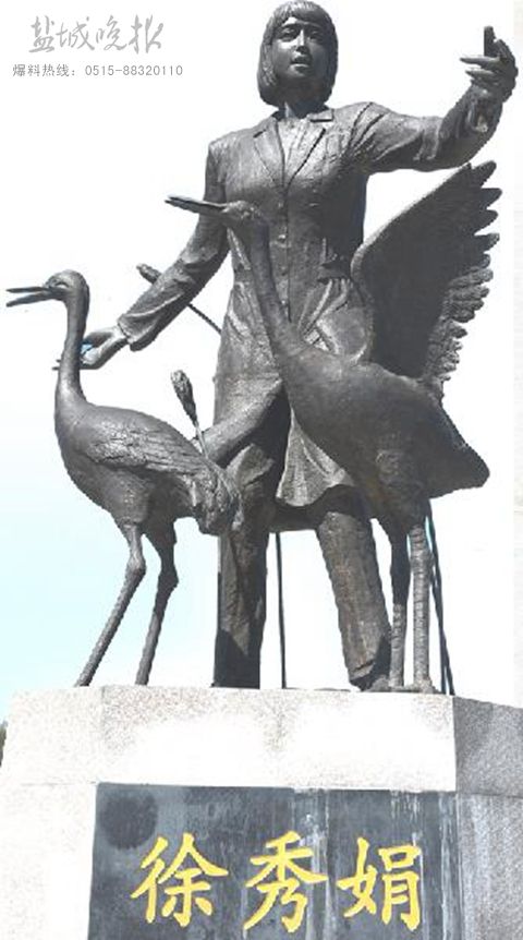 纪念碑上,“无私奉献”4个字,虽历经30年风霜,依然清晰如印。撷取秀娟生活片断制作的青铜雕像上,秀娟面色柔和,目视前方。在她左手伸展的前方,是9只形态各异的丹顶鹤群雕。两组雕像遥遥相对,彼此呼应,在复堆河水的环绕下,与周围湿地景致构成一幅自然和谐的画面。