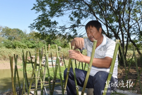 屋后意杨树下,一位工人正仿照秀娟生前用芦苇做过的形状,默默绑扎篱笆。来自黄尖的张金福在旁边搬运物料。