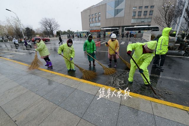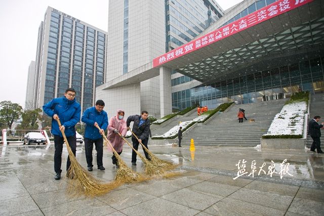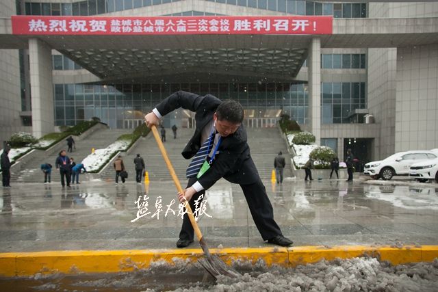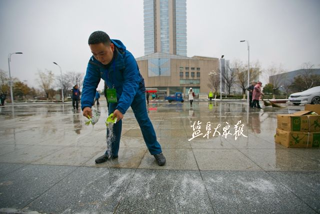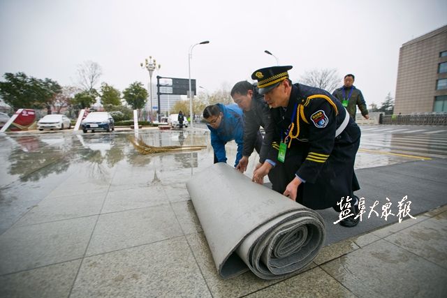 4日上午,市区上空飘起鹅毛大雪,工作人员紧急清扫路面、撒盐、铺设防滑地毯等,确保会议顺利举行。盐阜大众报报业集团全媒体记者 王金成 万者进 李思远 郜野乔 摄
