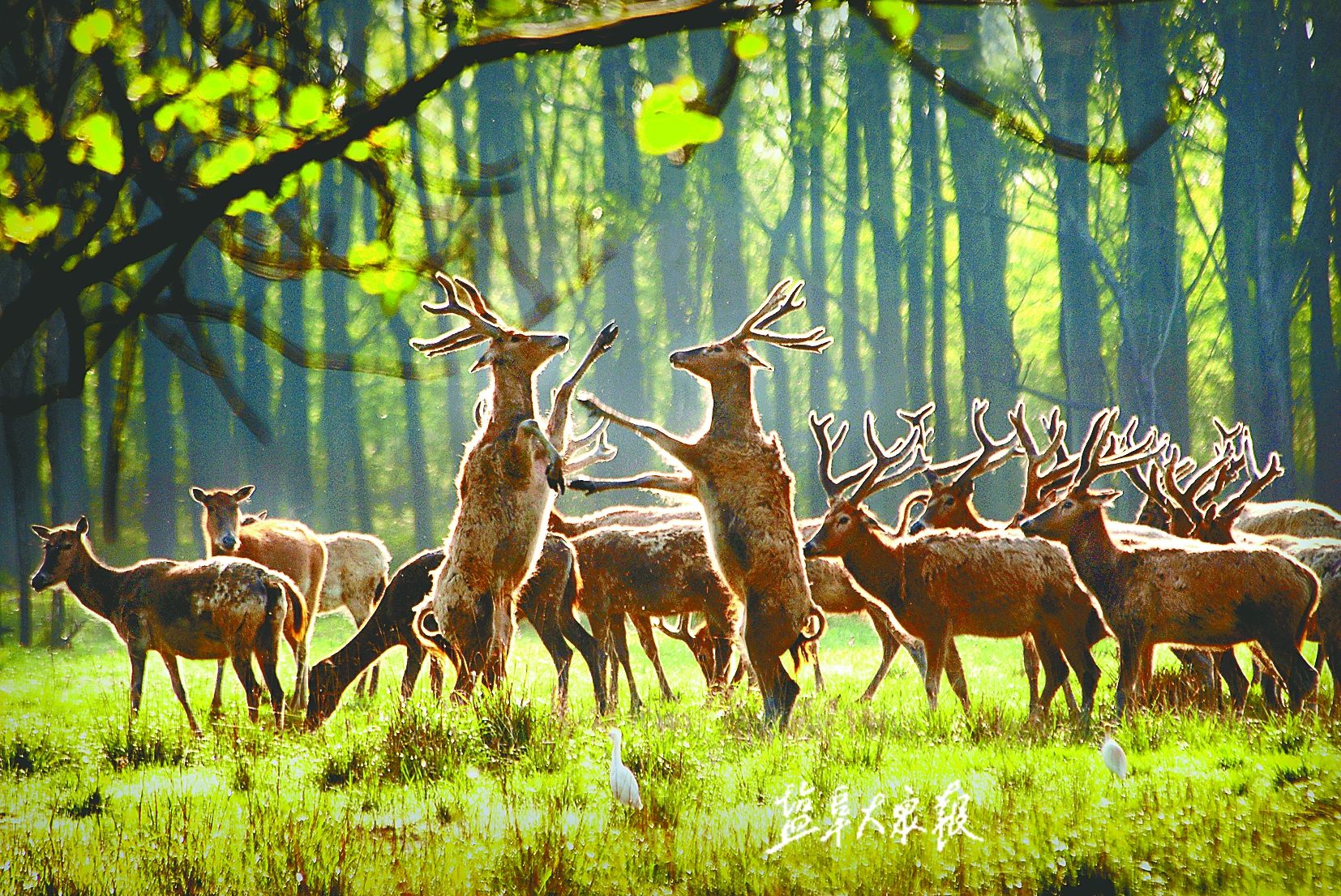 江苏麋鹿国家级自然保护区。盐城市是江苏唯一一个拥有两个国家级自然保护区的地级市。盐阜大众报报业集团全媒体记者 陈健强 谭 明 杨国美 孙华金 王金成 王亚洲 孙海鹏 摄