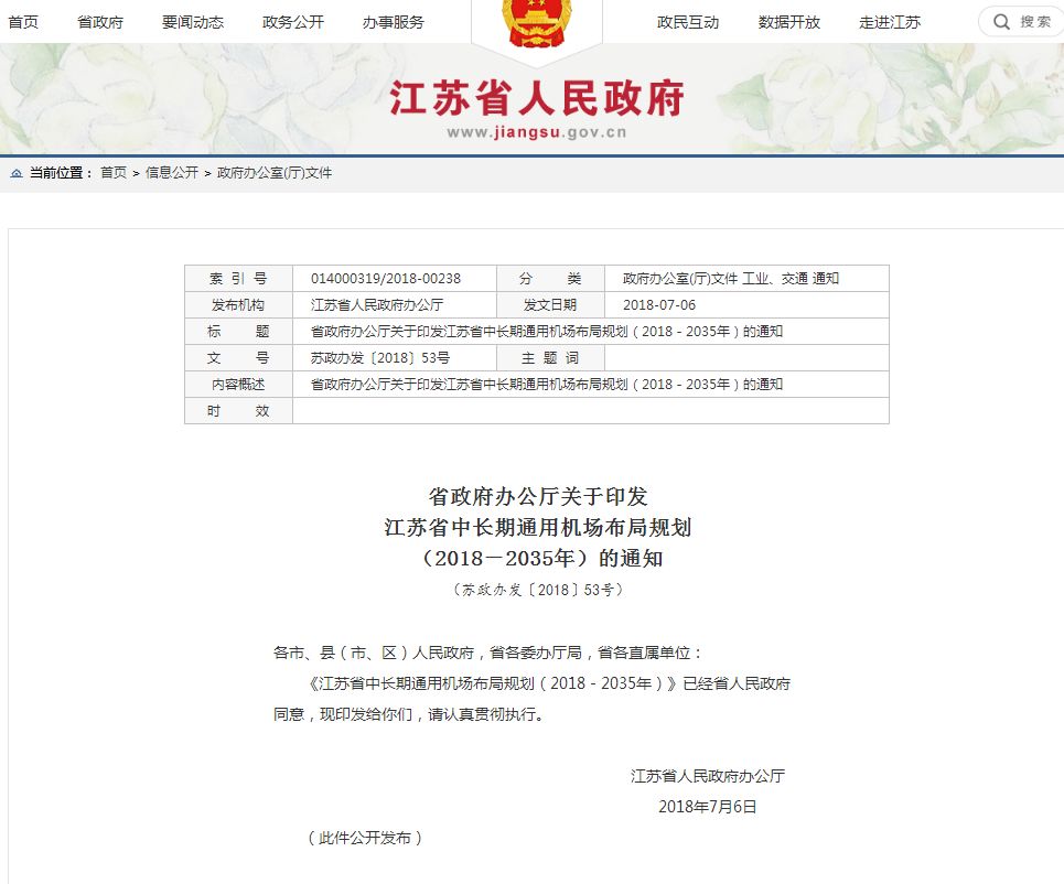 《江苏省中长期通用机场布局规划(2018-2035年)》