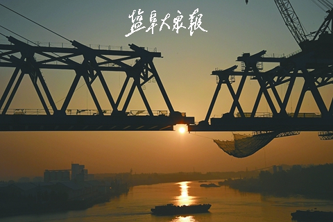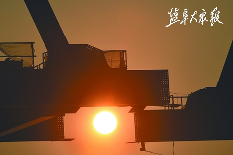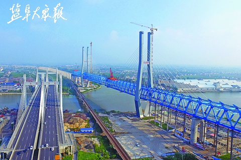 徐宿淮盐铁路跨新洋港斜拉桥是全线跨径最大的特大桥,也是全线控制性工程。该桥自2016年3月开始建设,2016年9月承台墩身施工,2017年11月1031号主塔封顶,2018年2月1032号主塔封顶,截至目前该桥完成北岸钢梁架设27节间斜拉索11组,南岸钢梁架设26节间斜拉索9组,完成总体进度95%,预计本月主桥合龙,然后开始桥面上的附属结构施工。图为新洋港斜拉桥鸟瞰图。记者 王亚洲 摄