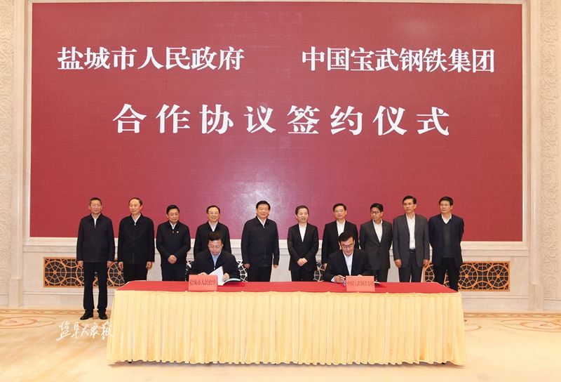 11月30日下午,盐城市政府与中国宝武钢铁集团有限公司在宁签署合作协议,在盐城滨海港工业园区新建2000万吨级“绿色、智慧、精品”钢铁生产基地。江苏省政府与中国宝武钢铁集团有限公司共同签署战略合作协议。签约前,省委书记娄勤俭、省长吴政隆会见了中国宝武钢铁集团有限公司董事长陈德荣、总经理胡望明一行,省委常委、南京市委书记张敬华,副省长马秋林,市委书记戴源参加。省政府秘书长陈建刚主持签约仪式,市委副书记、代市长曹路宝与宝山钢铁股份有限公司总经理邹继新代表双方签约。