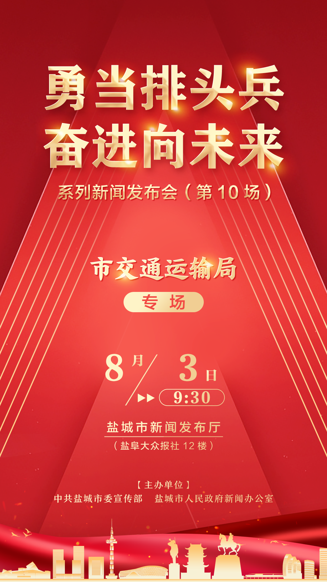 大家上午好。中共盐城市委宣传部、盐城市人民政府新闻办公室今天举办“勇当排头兵、奋进向未来”系列主题新闻发布会第10场——“市交通局”专场,欢迎大家。