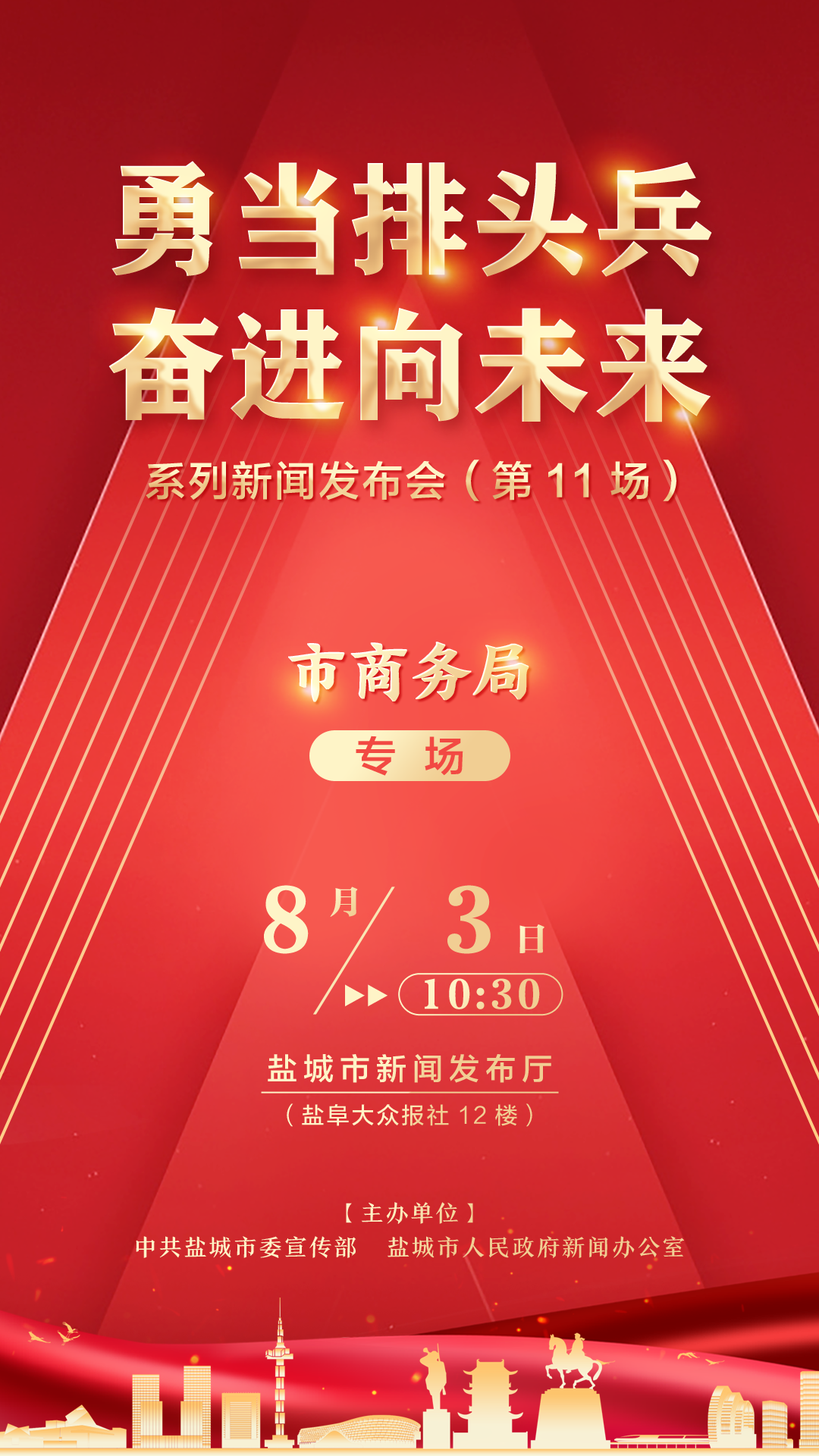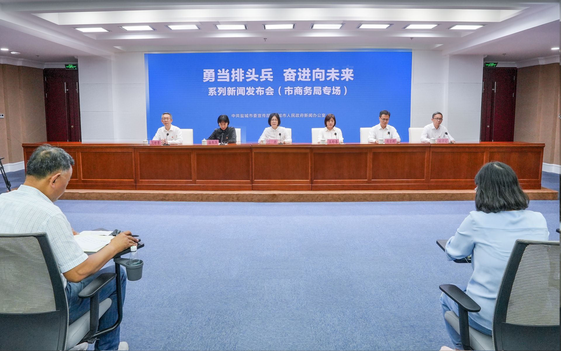 大家上午好。中共盐城市委宣传部、盐城市人民政府新闻办公室今天举办“勇当排头兵、奋进向未来”系列主题新闻发布会第11场——“市商务局”专场,欢迎大家。