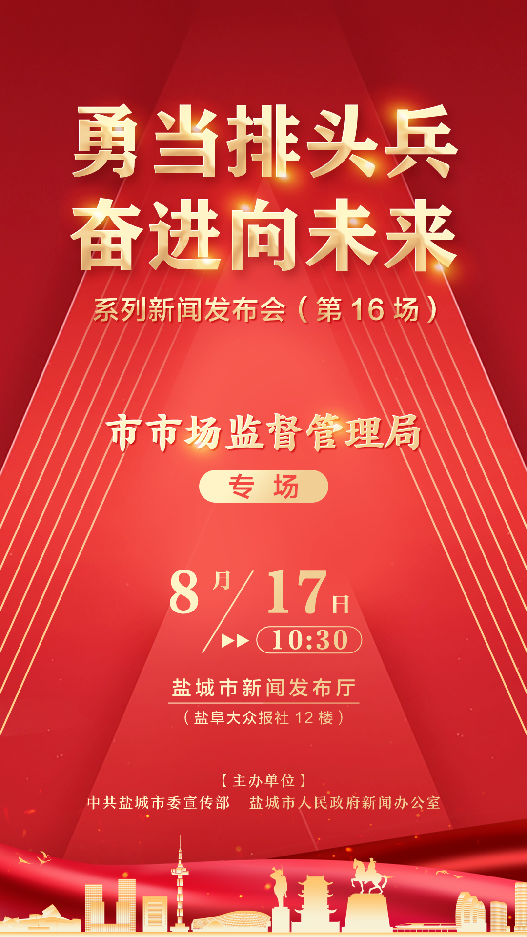 大家上午好。中共盐城市委宣传部、盐城市人民政府新闻办公室今天举办“勇当排头兵、奋进向未来”系列主题新闻发布会第16场——“市市场监督管理局”专场,欢迎大家。