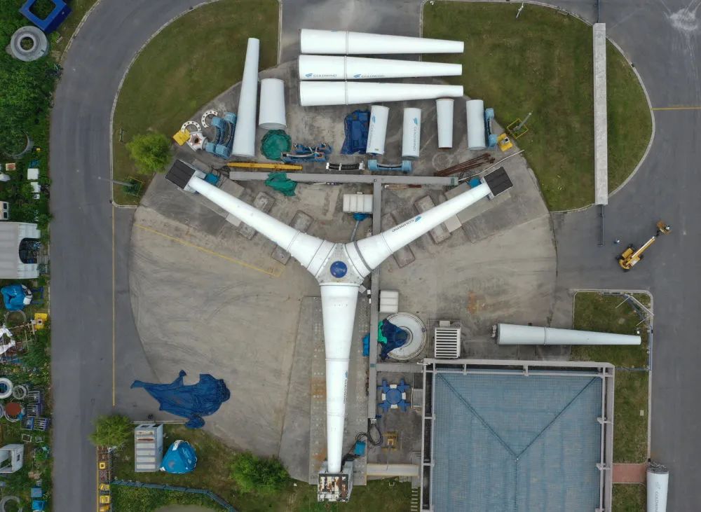 由金风科技自主设计建造的大兆瓦四自由度变桨偏航轴承试验台的外景照片。新华社记者李尕、杨磊摄