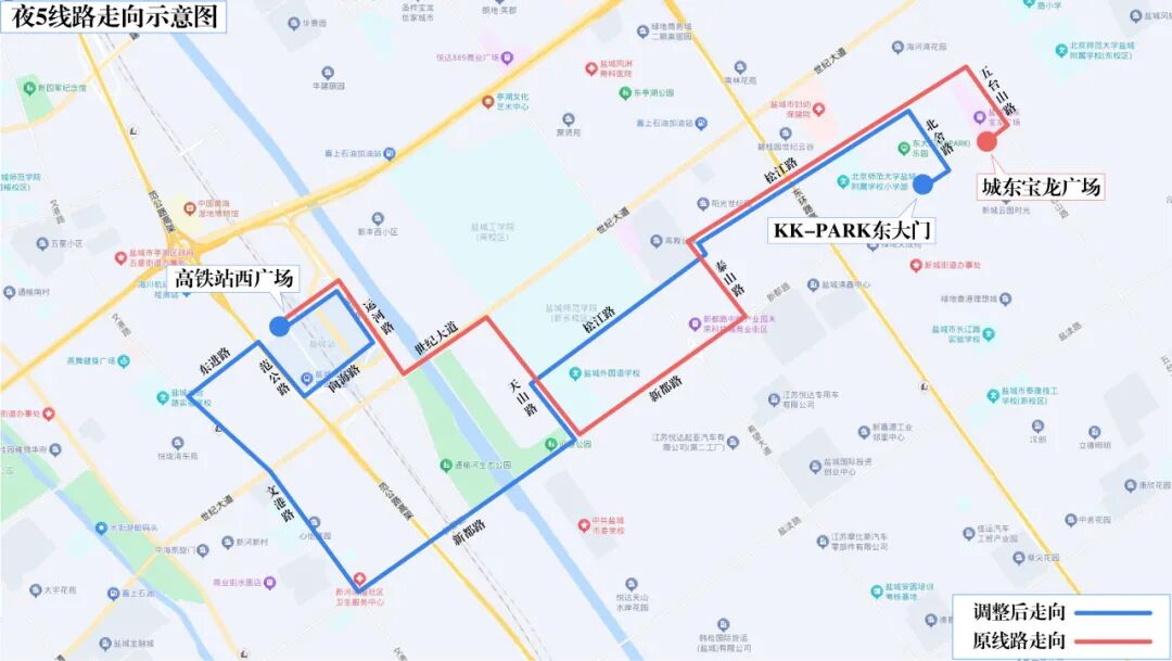 优化后走向:高铁站西广场(盐城市旅游集散中心)、东进路、运河路、向海路、范公路、东进路、文港路、新都路、天山路、松江路、泰山路、松江路、北舍路、新都路、KK-PARK东大门。