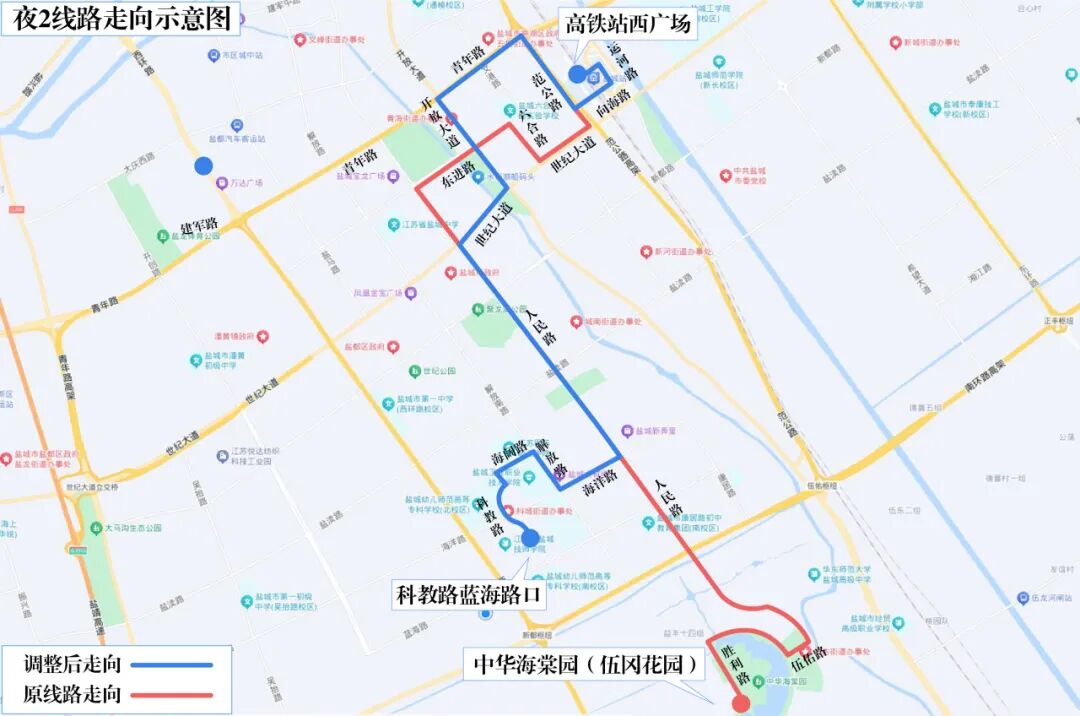 新增停靠站点:范公路东进路口、范公路五星路口、青年路范公路口、青年路文港路口、水街、悦达集团总部、金融城、海洋路胜利路口、中南世纪城、海洋路、高职园区、医药职业学院、科教路海阔路口(南)、盐城幼师高等专科(北校区)、技师学院(科教城校区)、科教路蓝海路口。