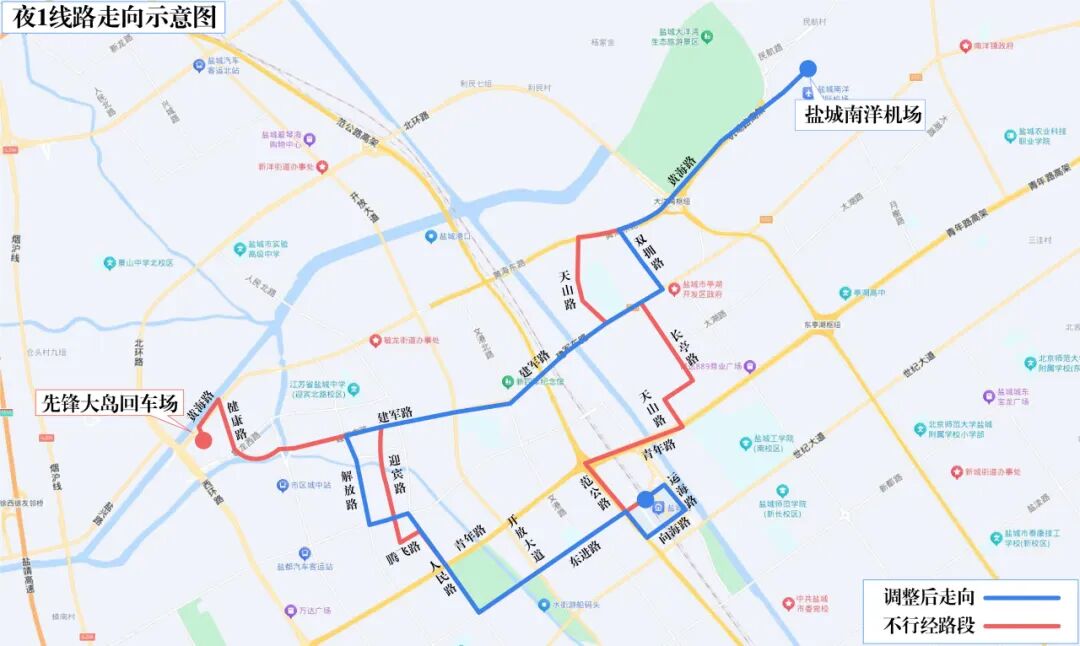 原线路走向:先锋大岛回车场、黄海路、健康路、建军路、迎宾路、腾飞路、人民路、东进路、运河路、向海路、范公路、青年路、天山路、小新河路、长亭路、建军路、双拥路、黄海路、盐城南洋机场。