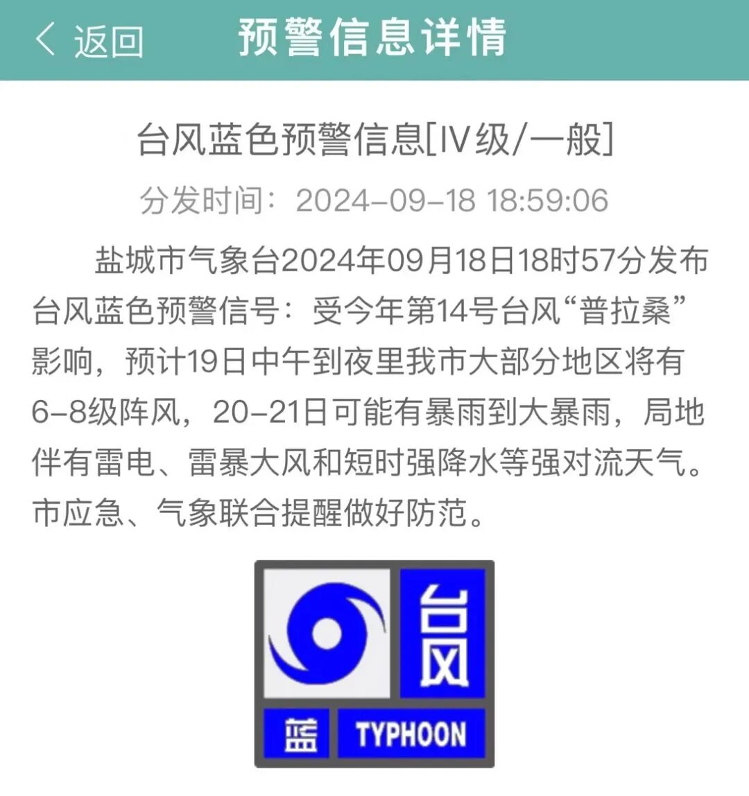 江苏省防汛抗旱指挥部决定,2024年9月18日18时起,启动我省防台风Ⅳ级应急响应。请各地各有关部门按照防御台风应急预案要求,坚持人民至上,生命至上,全力做好台风防御各项工作,维护人民生命财产安全。