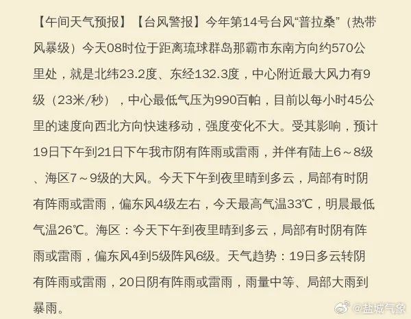 据江苏省气象台,今年第14号台风“普拉桑”的路径和台风“贝碧嘉”的路径相似,但略偏南一些。“普拉桑”的强度和“贝碧嘉”的强度相比,也相对弱一点。