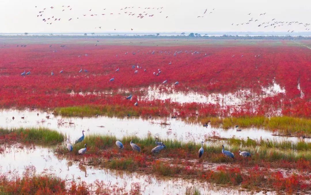 近200只灰鹤聚集在火红的盐蒿滩上悠然觅食,在它们周边还有一批普通鸬鹚、大雁、东方白鹳,或在水中停歇嬉戏,或在空中展翅飞翔……连日来,江苏盐城国家级珍禽自然保护区巡护人员监测发现,24.726万公顷的湿地上热闹起来了,越冬候鸟“先头部队”已陆续回到它们喜爱的栖息地。随着气温逐渐走低,将有更多候鸟奔赴此地越冬。