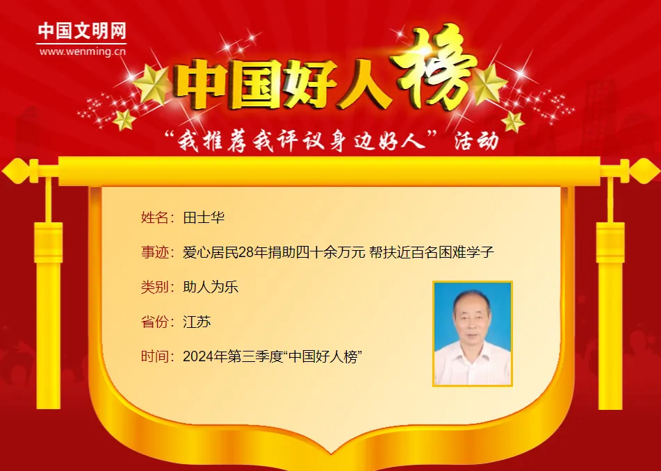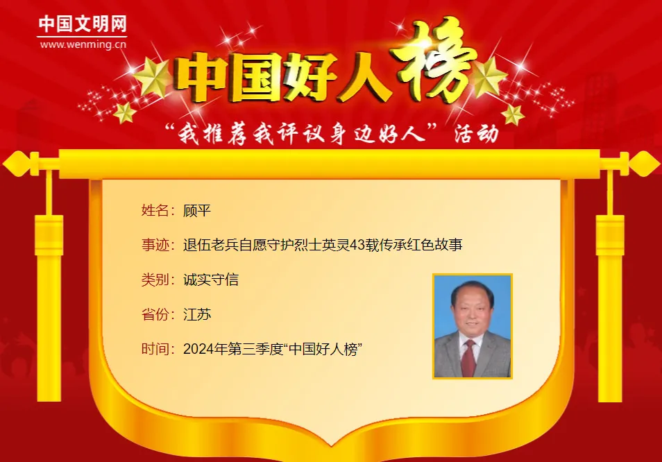 11月12日,2024年第三季度“中国好人榜”发布仪式暨全国道德模范与身边好人现场交流活动在湖北省十堰市举办。盐城2人光荣上榜。