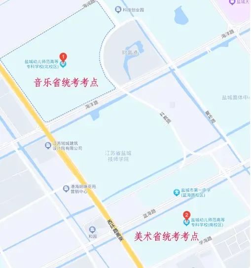 盐城幼儿师范高等专科学校有两个校区:一个是海洋路校区(北校区),在海洋路28号;一个是学海路校区(南校区),在学海路28号。本次艺术省统考两个考点都有考试,看清准考证别跑错考点哦。