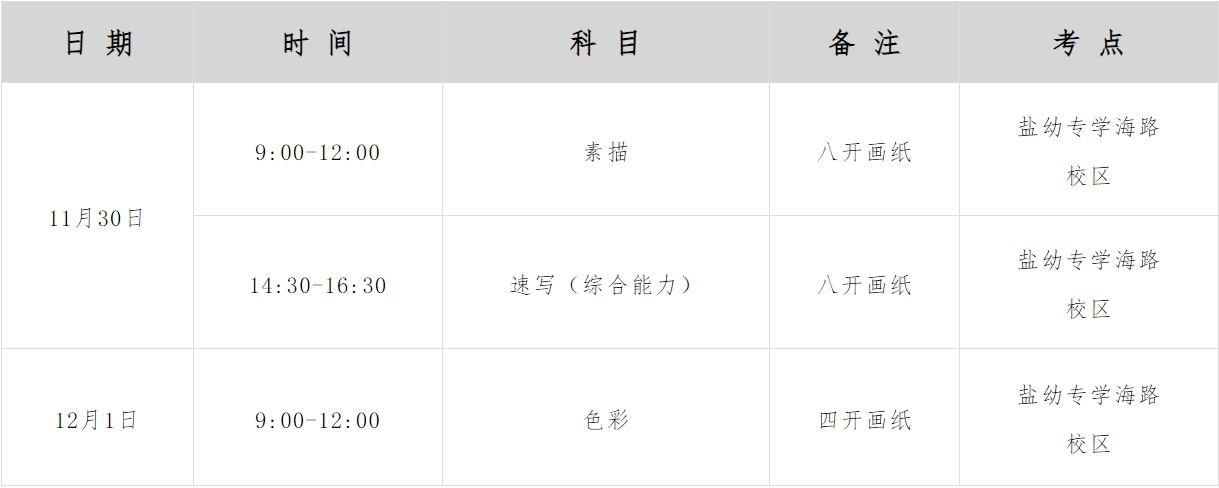 江苏省2025年普通高校招生美术类专业统考将于11月30日开考,盐城地区的所有美术考生在盐城幼儿师范高等专科学校学海路校区考点参加笔试。