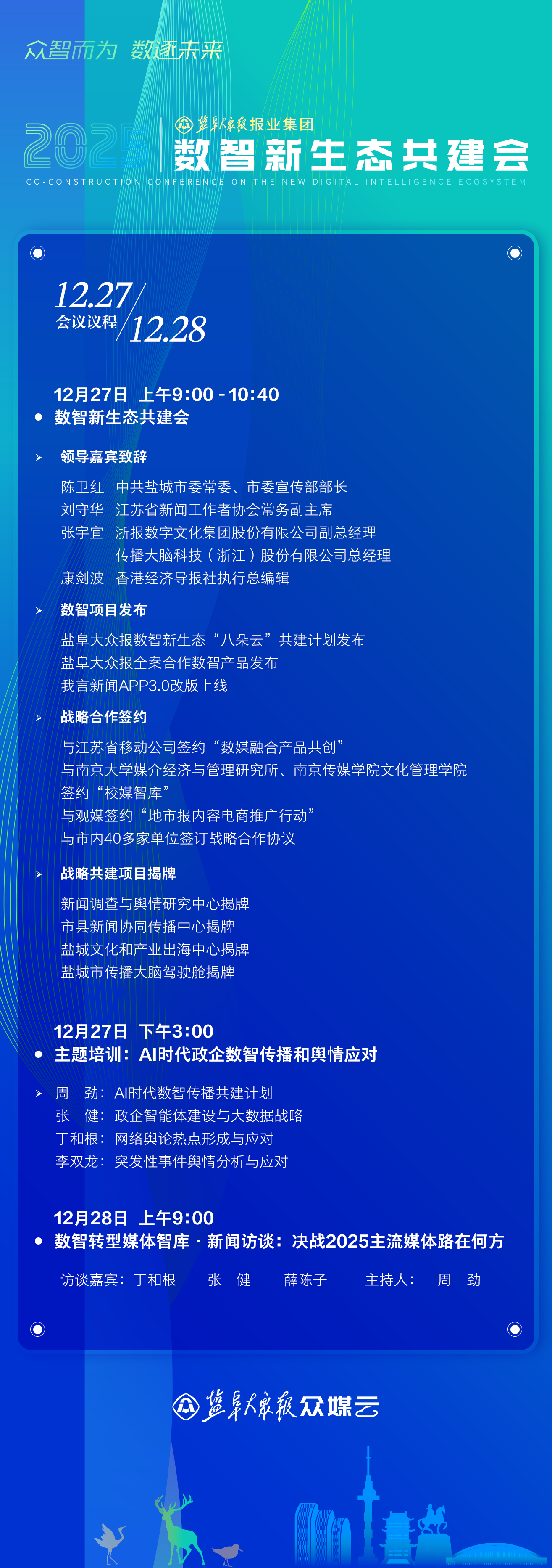 12月26日至28日,盐阜大众报报业集团将举行“众智而为数逐未来”数智新生态共建会,邀请学界专家、业界大咖和合作伙伴,共创数智化传播新生态,构建盐城全媒体宣传新格局,共同讲好新时代盐城高质量发展故事。