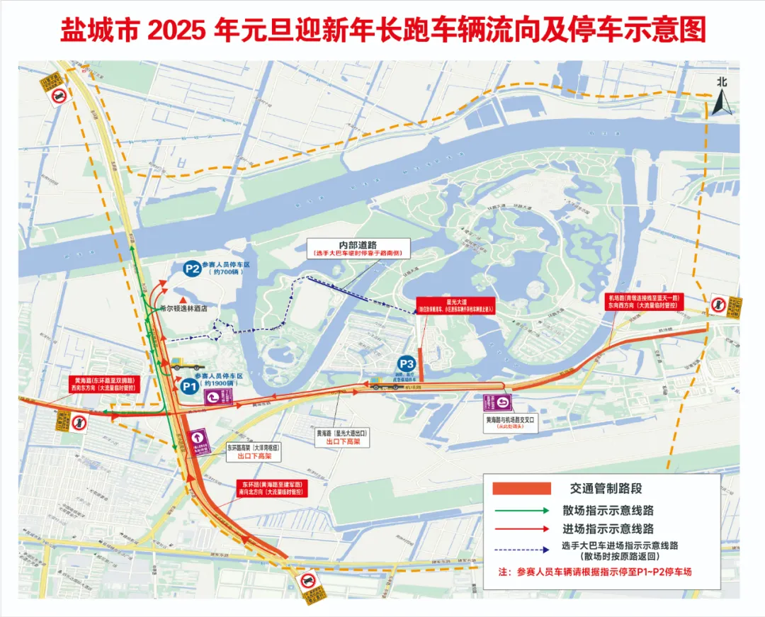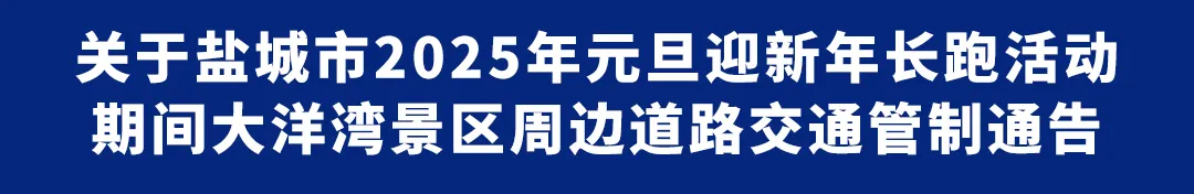 2025年1月1日(星期三)上午9时至11时30分,盐城大洋湾景区举办盐城市2025年元旦迎新年长跑活动,为确保活动安全顺利进行,根据《中华人民共和国道路交通安全法》,决定对大洋湾景区周边部分路段实行临时交通管制。现通告如下: