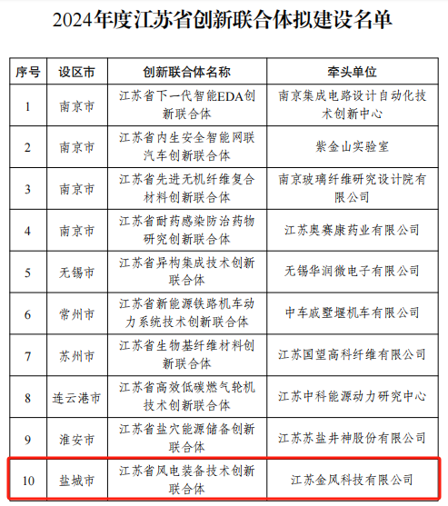 日前,江苏省科学技术厅公布2024年度江苏省创新联合体拟建设名单,其中,由我市江苏金风科技有限公司牵头组建的江苏省风电装备技术创新联合体成功入选。